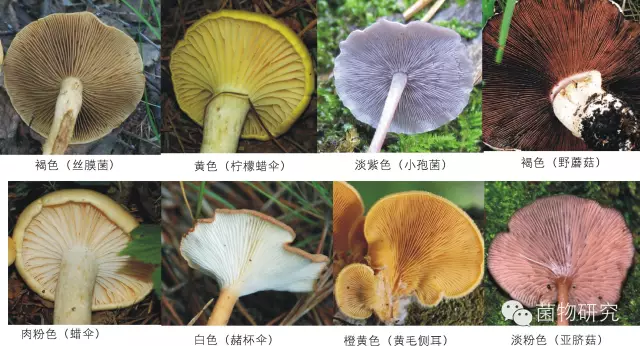 如同菌蓋的顏色,蘑菇菌褶的顏色也是豐富多彩的,也可作為識別蘑菇的輔助特征之一。值得注意的是菌褶的顏色往往和蘑菇的生長階段有關(guān)系,更多的和菌褶上所形成的孢子的顏色有有關(guān),一般孢子成熟后顏色加深(如蘑菇)。